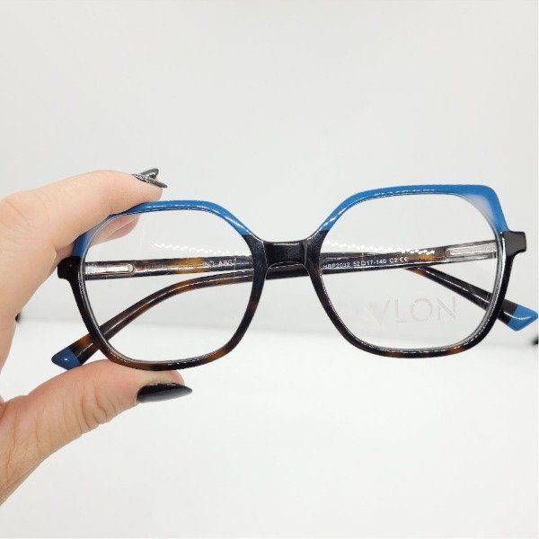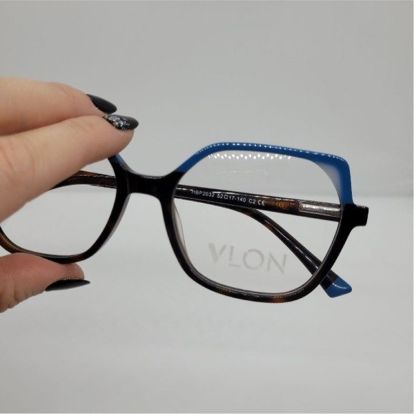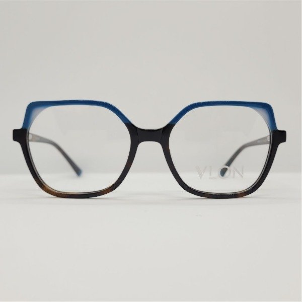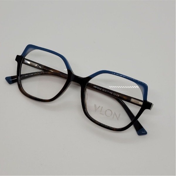 Armazón de acetato con patillas flexibles. Excelente calidad. Color negro y habano con detalles azules.