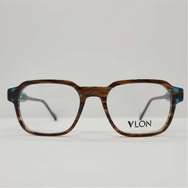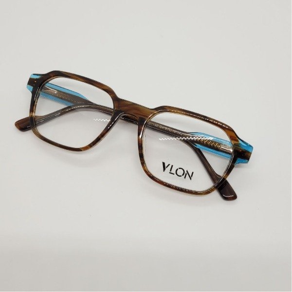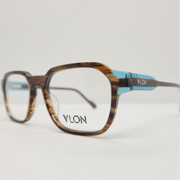 Armazón de diseño y resistente en acetato con patillas flexibles. Color habano con detalles en azul.
