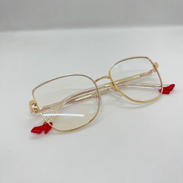 Estos anteojos para dama en tono dorado se destacan por un detalle único: decoración de zapatos de taco alto en las patillas, ideales para mujeres que aman la moda hasta en los pequeños detalles.
