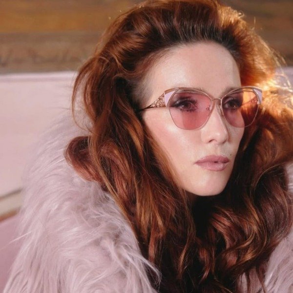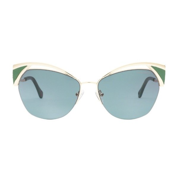 Modelo Cápsula, color verde esmeralda. Sofisticado diseño con frente de metal, estilo "cat eye", el que se destaca el aplique superpuesto sobre las cejas, con detalle calado y de color en los extremos. Exclusivas patillas, también de metal, con importante aplique de rosa en relieve, que da nombre la modelo. Terminales de acetato, una de ellas con corazón calado y la otra con el nombre en bajo relieve con color.