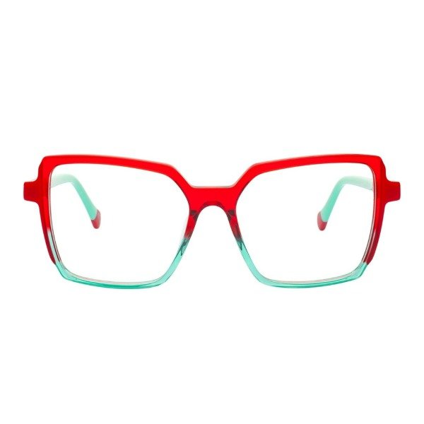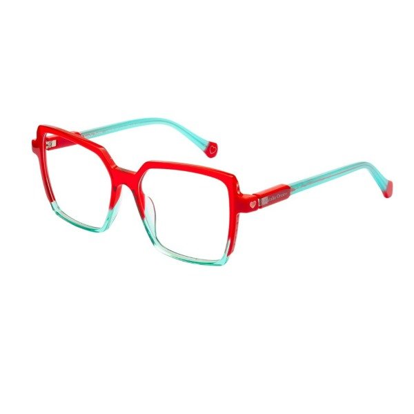 Armazón Natalia Oreiro realizado íntegramente en acetato color rojo y verde, con frente de forma cuadrada, en material combinado y detalle de corazones en bajo relieve los laterales. Las patillas continúan el diseño del frente, con Logo en bajo relieve con color y punteras a contratono con corazón de metal interno.