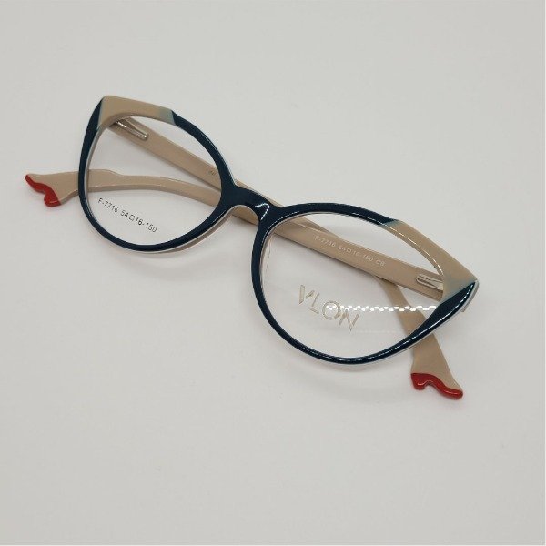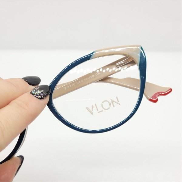 Armazón de diseño con zapatito rojo al final de la patilla. Color petroleo y nude. De acetato con patillas flexibles.