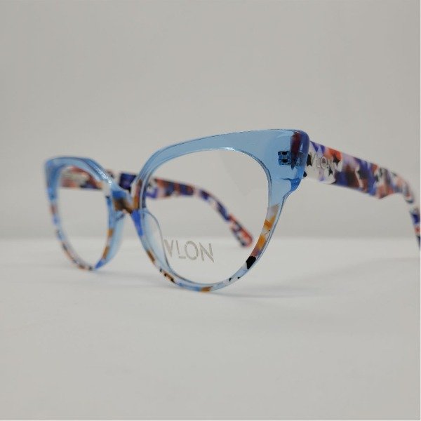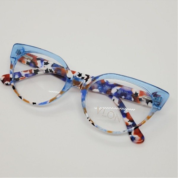 Armazón estilo gatito de acetato con patillas flexibles. Diseñado en color azul cielo y marmolado con rojo, blanco y azul